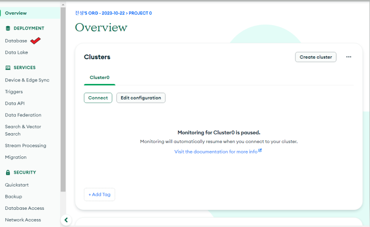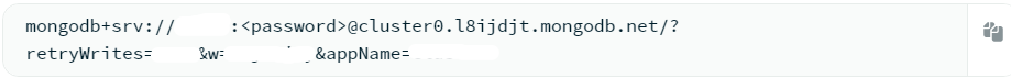이런 형태의 주소인데 정보를 가린 첫번째 부분은 userName이 들어가고 <password> 부분에 <>을 포함해서 지워주고 클러스터를 생성할 때 설정한 비밀번호를 입력해야한다.