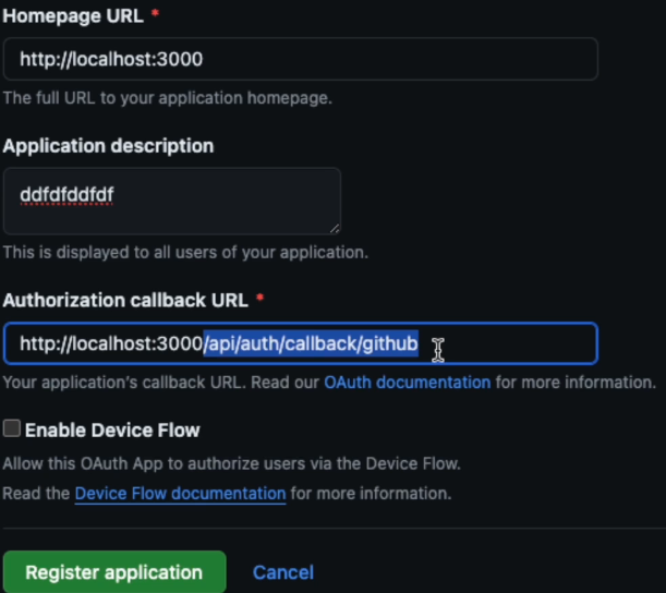 공식문서에서 확인할 수 있는 콜백 url인데 /api부터 복사해서 github 설정에 넣어준다.