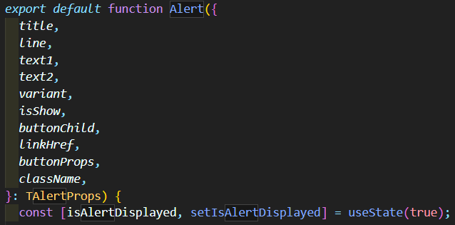 코드의 props를 잠깐 살펴보면 isShow는 button을 보일지 말지 설정하는 것이고 linkHref와 buttonProps로 버튼에 설정될 페이지 이동과 onClick 이벤트를 대비한 모습니다. 그리고 아래의 isAlertDisplayed 상태는 원래 isVisible이라는 이름으로 Alert의 엑스버튼이 동작하도록 만든 상태였는데, 이름이 isShow와 비슷하다는 리뷰를 받아서 저렇게 명확한 이름으로 수정했다.
